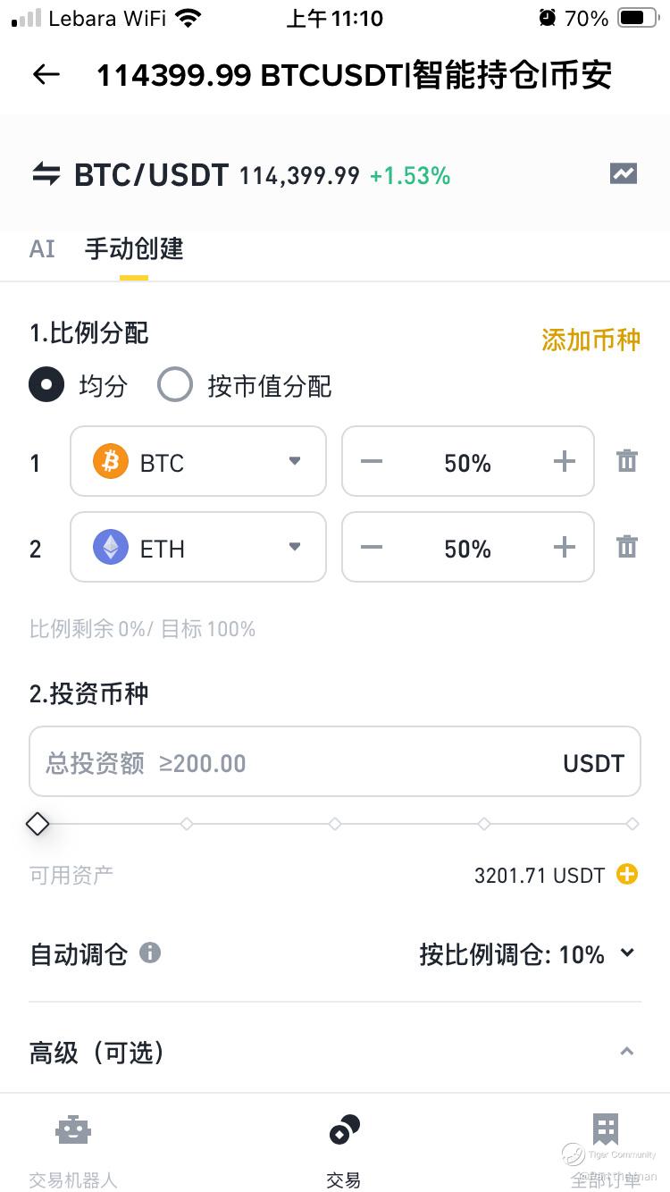 在智能持仓界面(如图),用户可以设置不同币种的比例分配,例如我设置了 BTC 和 ETH 各 50%,系统会根据比例进行自动调仓。更重要的是,它支持 自动调整仓位 ——当某一币种因行情波动而比例失衡时,系统会自动买卖,帮助投资者维持原始目标配置。这种方式既能降低操作频率,又能让投资者在波动中持续保持纪律性投资。