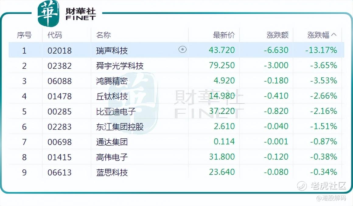 截至收盘, $瑞声科技(02018)$ 大跌13.17%, $舜宇光学科技(02382)$ 也下滑3.65%,$鸿腾精密(06088)$ 跌3.53%,丘钛科技(01478.HK)跌2.66%,比亚迪电子(00285.HK)跌2.16%。