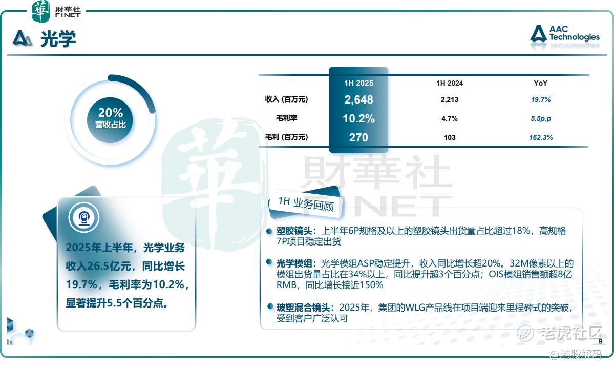 光学业务延续了迅猛的增长态势,收入26.5亿元,同比增长19.7%;毛利率为10.2%,显著提升5.5个百分点。