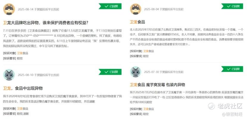 在黑猫投诉平台上,消费者反馈在卫龙产品中吃出异物、食后出现身体不适等问题,更是比比皆是。