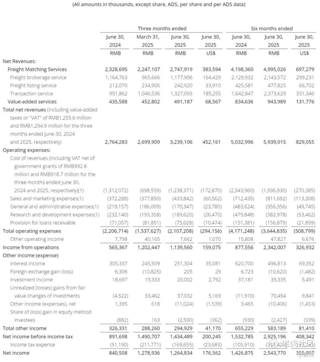 满帮2025年第二季度营收为32.39亿元(约4.52亿美元),运营利润为11.4亿元,净利为12.65亿元。