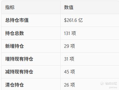 持仓数量:共披露 131项持仓,其中新增持仓29项,增持31项,减持45项,清仓26项.