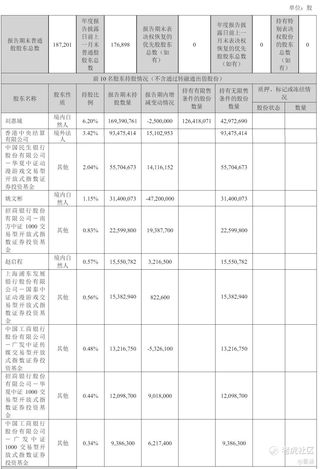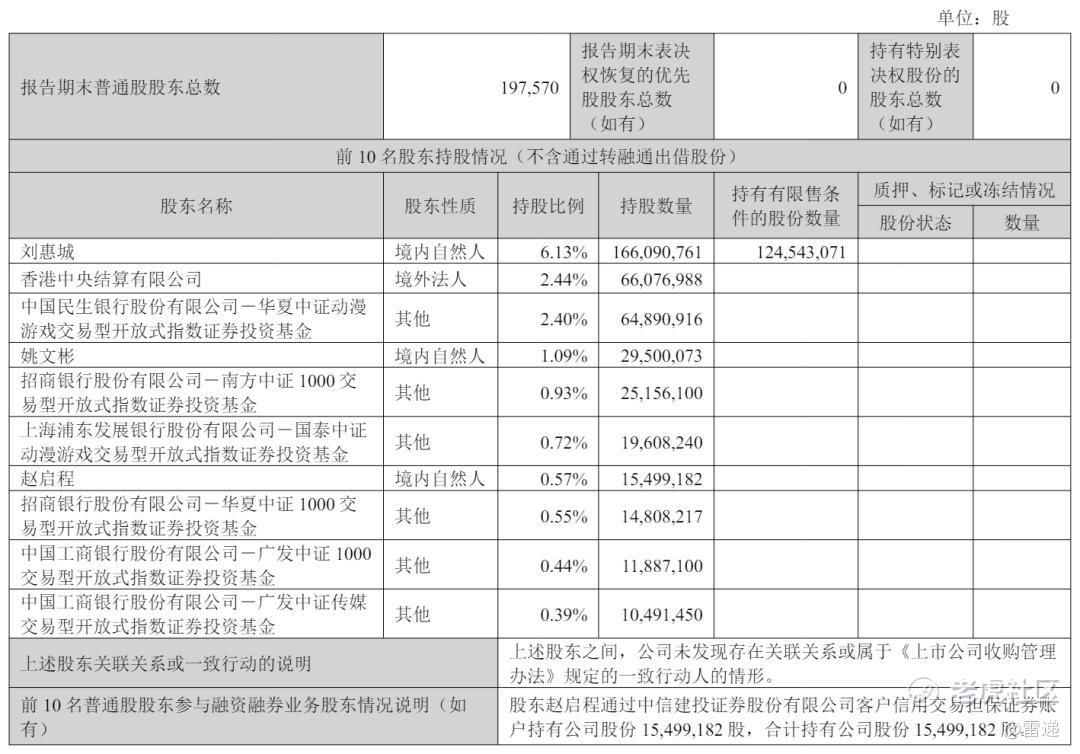 截至2024年12月31日,刘惠城持股为6.2%,香港中央结算有限公司持股为3.42%,中国民生银行股份有限公司-华夏中证动漫游戏交易型开放式指数证券投资基金持股2.04%,姚文彬持股为1.15%,中国工商银行股份有限公司-广发中证传媒交易型开放式指数证券投资基金持股为0.83%,赵启程持股为0.57%,上海浦东发展银行股份有限公司-国泰中证动漫游戏交易型开放式指数证券投资基金持股为0.56%;