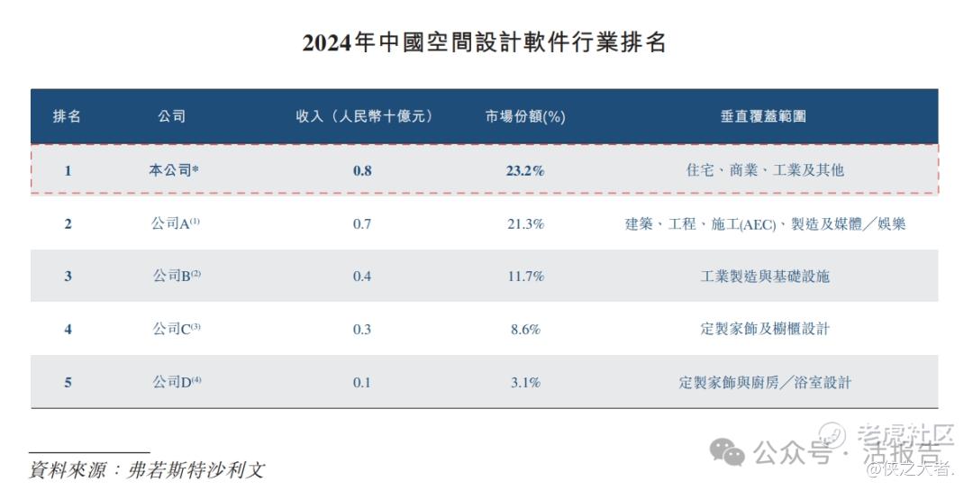 根据弗若斯特沙利文的资料,按2024年的收入计,公司是中国最大的空间设计行业软件提供商,约占市场份额的23.2%。公司的产品矩阵主要包括: