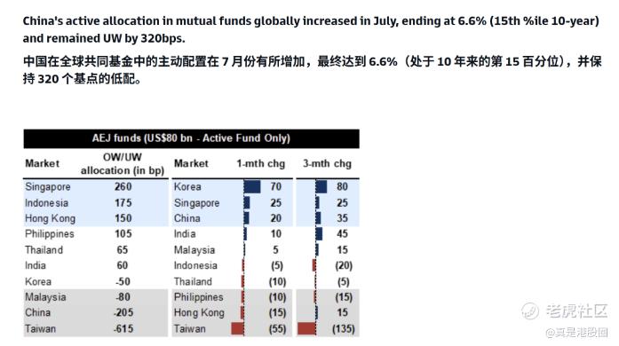 再换高盛的PB视角看,中资股在全球共同基金中的主动配置在7月份有所增加,最终达到6.6%,处于10年来的15%,并保持3.2%的低配。