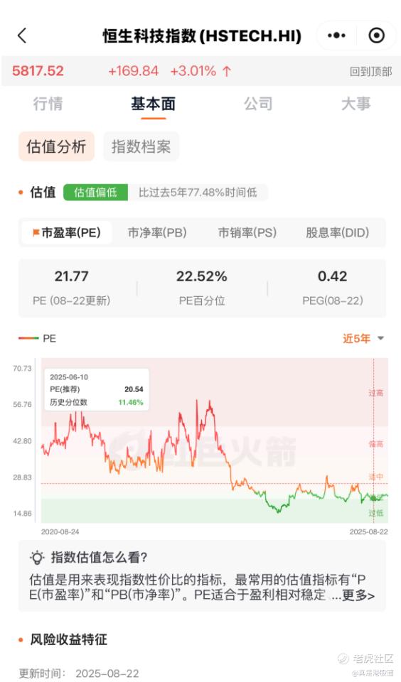 按照小程序“红色火箭”上的历史数据来看,恒生科技指数目前的市盈率为21倍,市盈率的历史百分位仅为22.5%,仍是估值过低的区间。另外,抓热点可用红色火箭,红色火箭看这些估值分位数非常方便,不像其他软件看起来很复杂,大家感兴趣也可参照看看。