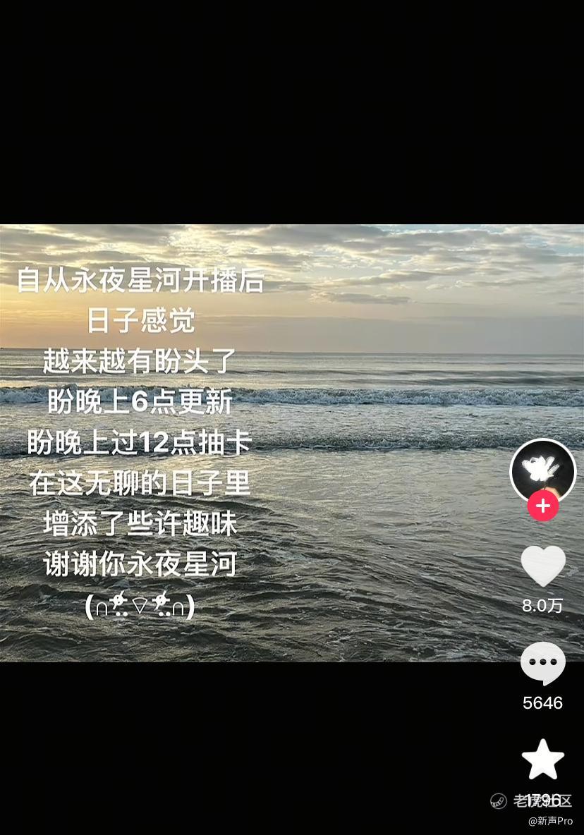 一条8万点赞的二创视频使用这首歌作为BGM,配上日出时刻翻涌的海浪场景,博主写道,「自从永夜星河开播后,日子感觉越来越有盼头了。」评论区最高赞的网友回复,「永夜星河就像是一个开关,让全世界都解冻了,都感觉很幸福,都想变好。」