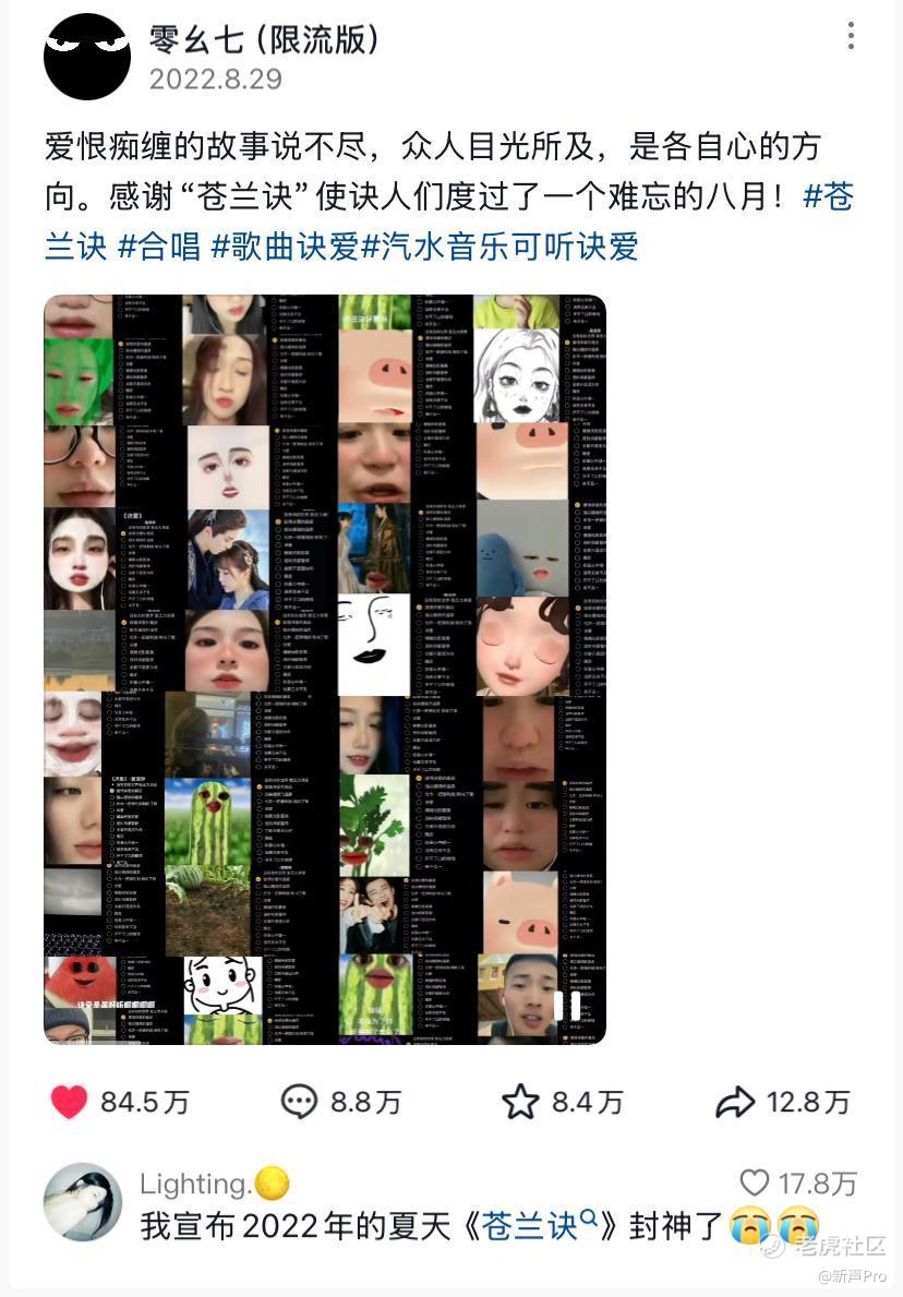 《苍兰诀》完播后,一位来自抖音的观众拼接了全网合唱《诀爱》的名场面视频,获得了80万+的点赞和超过八万条评论。在评论区,「诀人」们说像被上了同心咒一般同喜同悲,对剧集的热爱和不舍,被浓缩在了这首合唱里,一条评论写道,「苍兰诀结局,苍兰诀的故事永远延续」,获得了13.8万点赞。