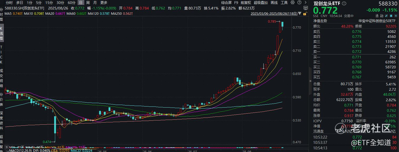 8月26日,市场盘整,科技成长方向跌幅居前,覆盖覆盖科创板+创业板高成长龙头的双创龙头ETF(588330)随市回调,场内价格现跌1.15%,实时成交额超6200万元,交投较为活跃!