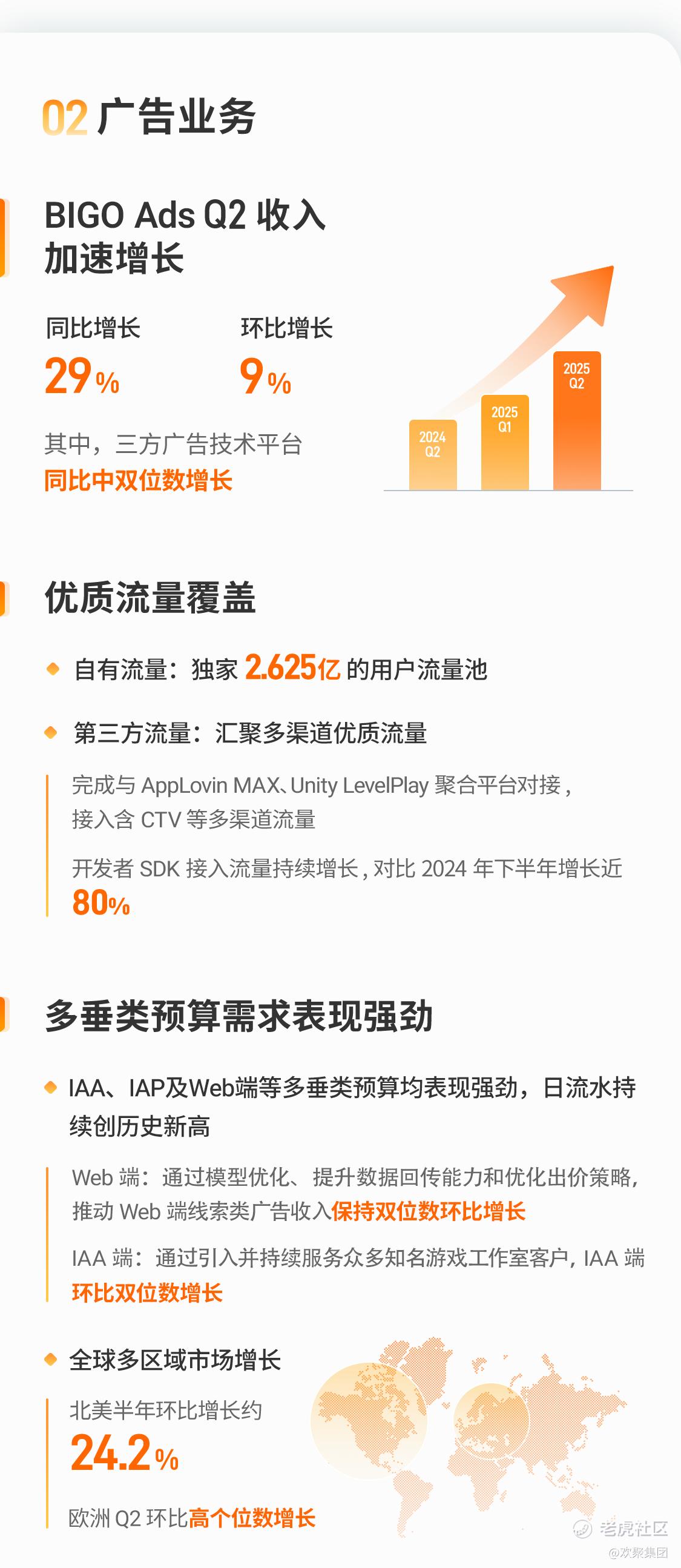 非直播业务收入同比增长25.6%,占集团总营收比例增至26.1%。凭借集团的全球运营能力、技术积累、基础设施和生态布局,战略性业务BIGO Ads收入同比强劲增长29%。