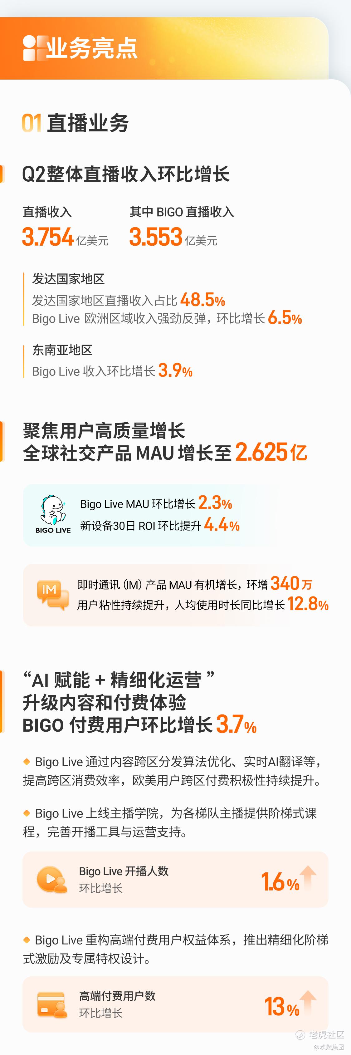基于用户高质量增长策略,全球社交产品MAU增长至2.625亿,BIGO整体直播付费用户数环比增长3.7%;第二季度,集团核心直播收入实现环比正增长,达3.754亿美元。
