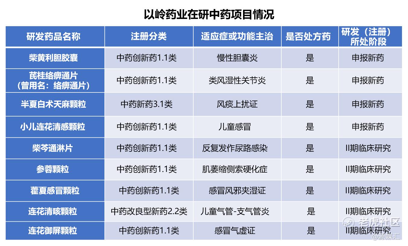 专利中药方面,数据显示,以岭药业近五年有连花清咳片、通络明目胶囊、解郁除烦胶囊、益肾养心安神片、芪防鼻通片5个新药陆续获批。在研品种中,3个1.1类中药创新药柴黄利胆胶囊、芪桂络痹通片、小儿连花清感颗粒和1个3.1类中药新药已申报新药,5个中药创新药处于Ⅱ期临床研究阶段。