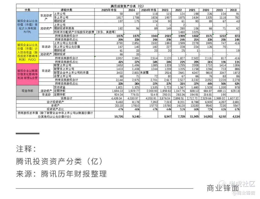 更值得注意的是投资端的表现。上半年,腾讯投资资产总额达到9483亿元,创下历史新高,占总资产(20133亿元)的47%。其中股权类资产总值达到10726亿元,约为腾讯总市值(约5.5万亿元)的19.5%。