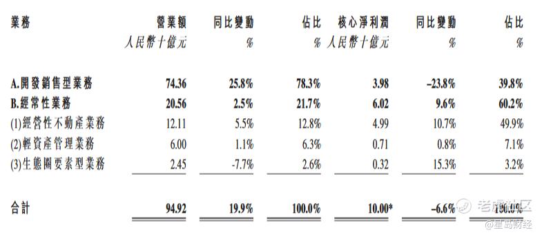 同期,华润置地经常性业务收入205.6亿元,同比微增2.5%,虽然占总营收的比重仅有21.7%,却在70%以上的毛利率拉动下,贡献了60.2亿元的核心净利润,占总利润比值达60.2%。