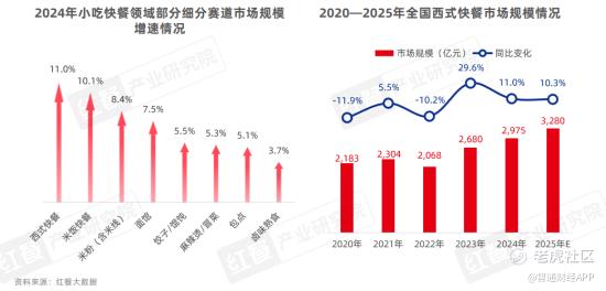 在这一大背景下,西式快餐依托其丰富的产品线和高度标准化的运营模式,实现了快速市场扩张。红餐产业研究院发布的《西式快餐品类发展报告2025》指出,2024年全国西式快餐市场规模达到2,975亿元,同比增长11.0%,增速领跑小吃快餐细分赛道;截至2025年3月,全国西式快餐门店数量已达32.5万家,同比增长6.6%,预计全年市场规模增速仍将保持在10%以上。