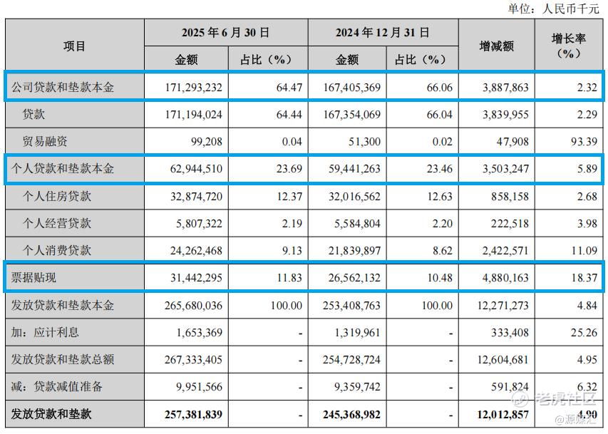 从贷款结构来看,截至2025年6月末,兰州银行发放的公司贷款和垫款本金为1712.93亿元,较年初增加38.88亿元,增幅2.32%;个人贷款和垫款本金为629.45亿元,较年初增加35.03亿元,增幅5.89%;票据贴现为314.42亿元,较年初增加48.80亿元,增幅18.37%。