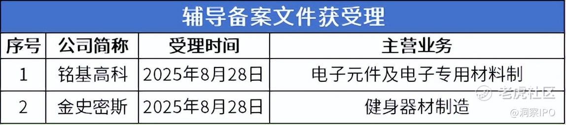 铭基高科公告显示,2025年8月26日,公司向广东证监局提交了提交了辅导备案登记材料,辅导机构为招商证券。8月28日,广东证监局受理公司的上市辅导备案申请,公司进入辅导期。