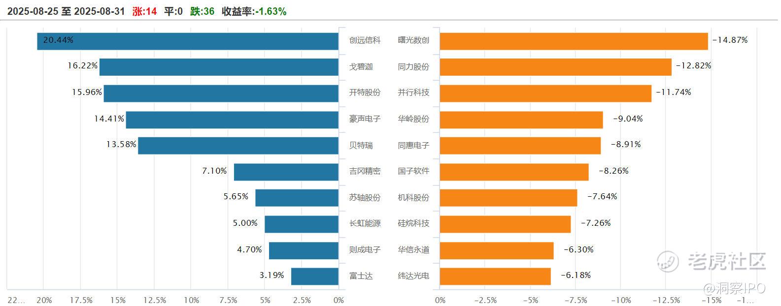 上周(8月25日-8月31日),北证50指数周跌1.63%至1574.25点。北证50成分股中,14只上涨,0只平盘,36只下跌。