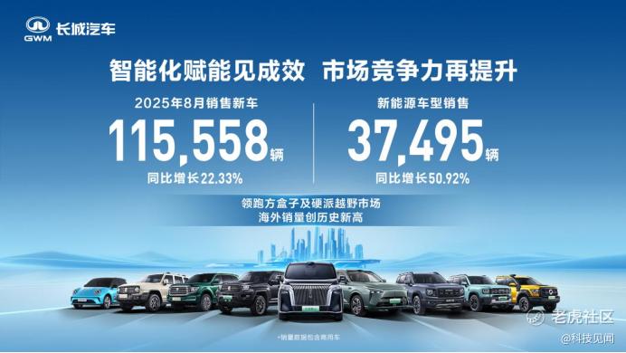 8月,长城汽车销售新车115,558辆,同比增长22.33%,创历史最佳8月销量表现;新能源车型销售37,495辆,同比增长50.92%;20万元以上车型销售31,631辆,同比增长50.57%;海外销售45,166辆,同比增长11.65%,再创历史新高;方盒子车型销售54,718辆,同比增长37.29%,稳居方盒子销冠。2025年1—8月,长城汽车销售新车789,719辆,同比增长5.94%。