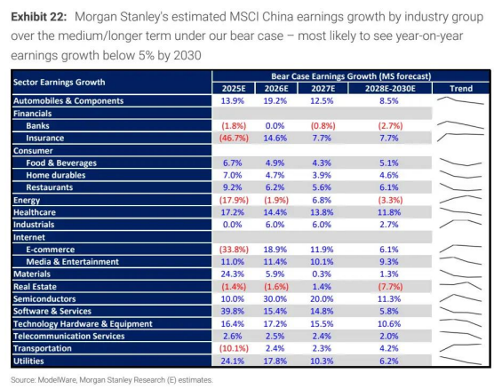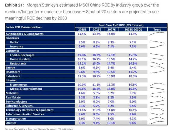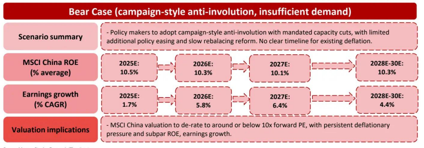 MSCI 中国 ROE 2030 年将跌至 10.2%(低于长期均值),2025-2030 年 earnings 复合增速仅 4.4%;估值可能下探至 10 倍前瞻市盈率以下,反映持续通缩与盈利疲软的压力。