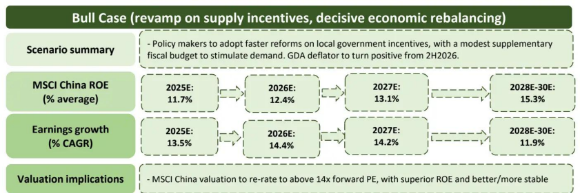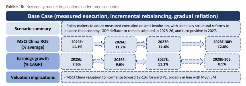 此场景下,企业定价权与产能整合效率显著提升,2030 年 MSCI 中国 ROE 将达 16.3%,2025-2030 年 earnings 复合增速 11.9%;估值有望突破 14 倍前瞻市盈率,重拾对 MSCI 新兴市场的 10% 溢价。