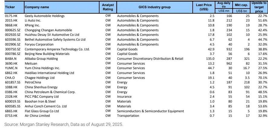 基于 “反内卷” 主题,摩根士丹利通过 “分析师自下而上筛选 + 量化标准”,确定 22 只核心受益个股,覆盖汽车、消费服务、能源、材料等 9 个行业(见下图)。