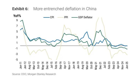2021 年以来,受房地产市场低迷与制造业投资激增双重影响,中国通缩压力持续加剧。截至 2025 年中,中国 GDP 平减指数已连续 9 个季度为负,生产者价格指数(PPI)通缩周期更是长达 34 个月。