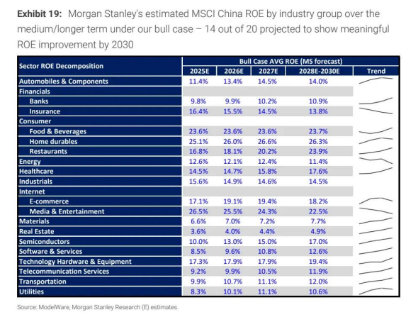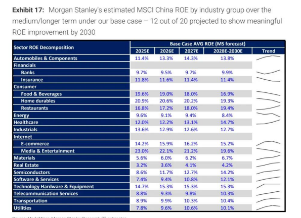 下图:摩根士丹利在基准情景下对 MSCI 中国各行业板块中期 / 长期净资产收益率(ROE)的预测 ——20 个行业板块中有 12 个预计到 2030 年将出现显著的 ROE 改善
