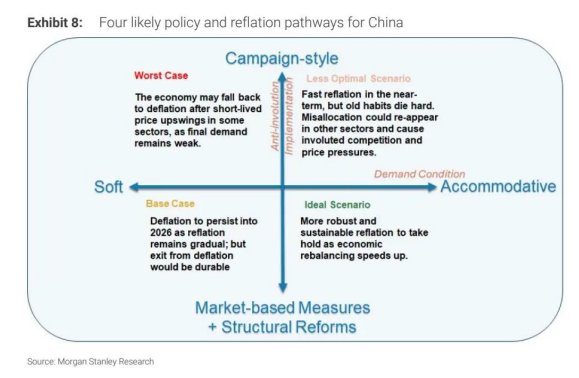 摩根士丹利基于 “反内卷” 政策效果与需求刺激力度,构建了 MSCI 中国指数净资产收益率(ROE)的三大场景,核心差异体现在政策执行方式(行政化运动式 vs 市场化结构化)与需求环境(需求不足 vs 需求适度)的组合。