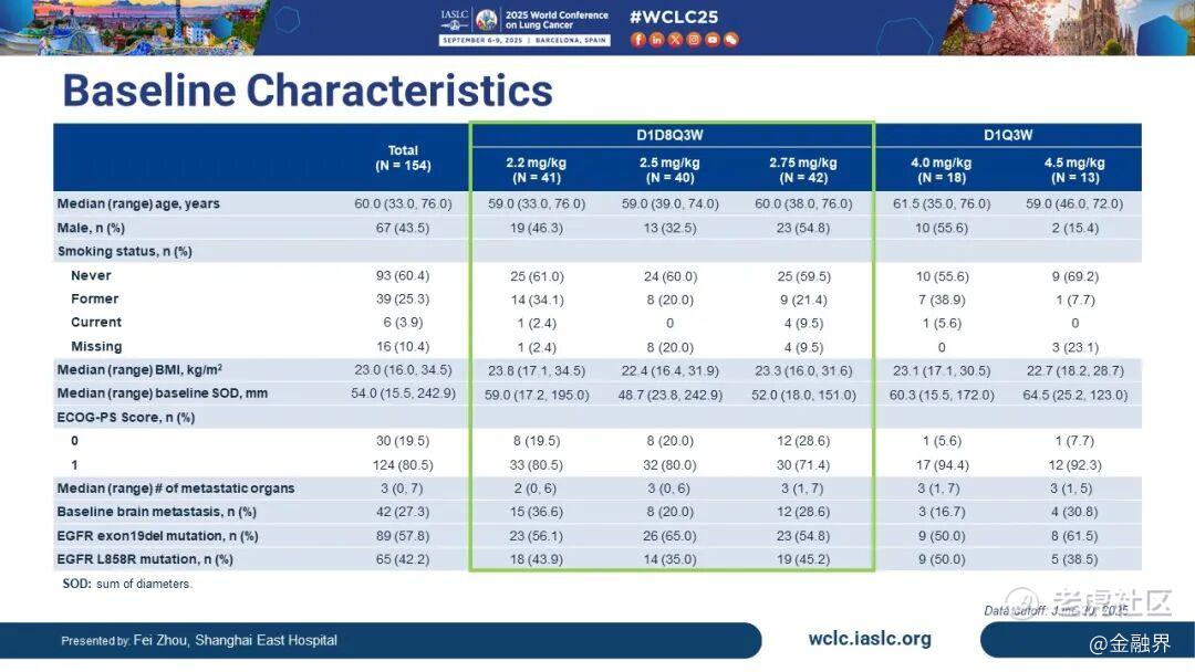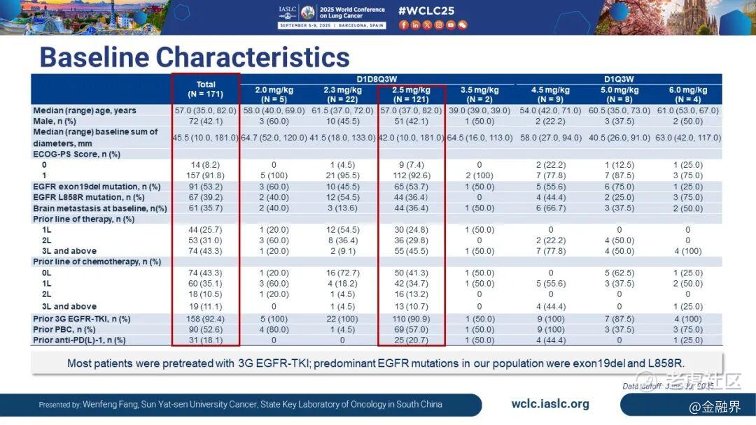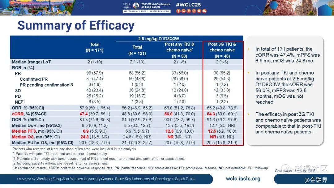 本次汇报的研究结果来自两项 I/II 期研究, 这两项研究评估了iza-bren (EGFR×HER3双抗ADC)单药治疗局晚期或转移性实体瘤患者。截至2024年12月5日,共纳入171例 EGFRmt NSCLC 患者;其中,121 例患者接受iza-bren 2.5mg/kg 的剂量治疗,在该治疗组中,有 50 例患者既往接受过 EGFR-TKI 但未接受过化疗。研究结果如下: