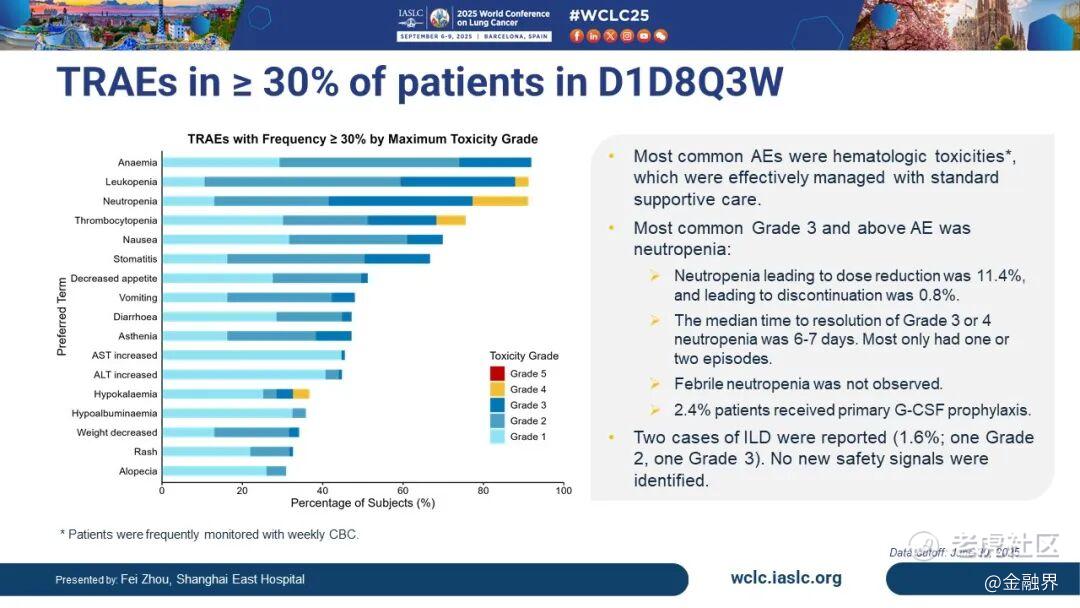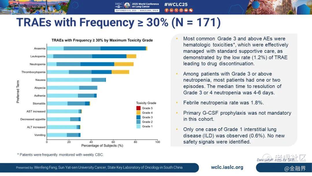 安全性可耐受:本研究中仅2.4%患者接受过粒细胞集落刺激因子(G-CSF)一级预防治疗,iza-bren联合奥希替尼安全可耐受,血液学毒性为主,≥G3级中性粒细胞减少消退快(中位6-7天)且导致停药率低(0.8%)。未报告发热性中性粒细胞减少症。