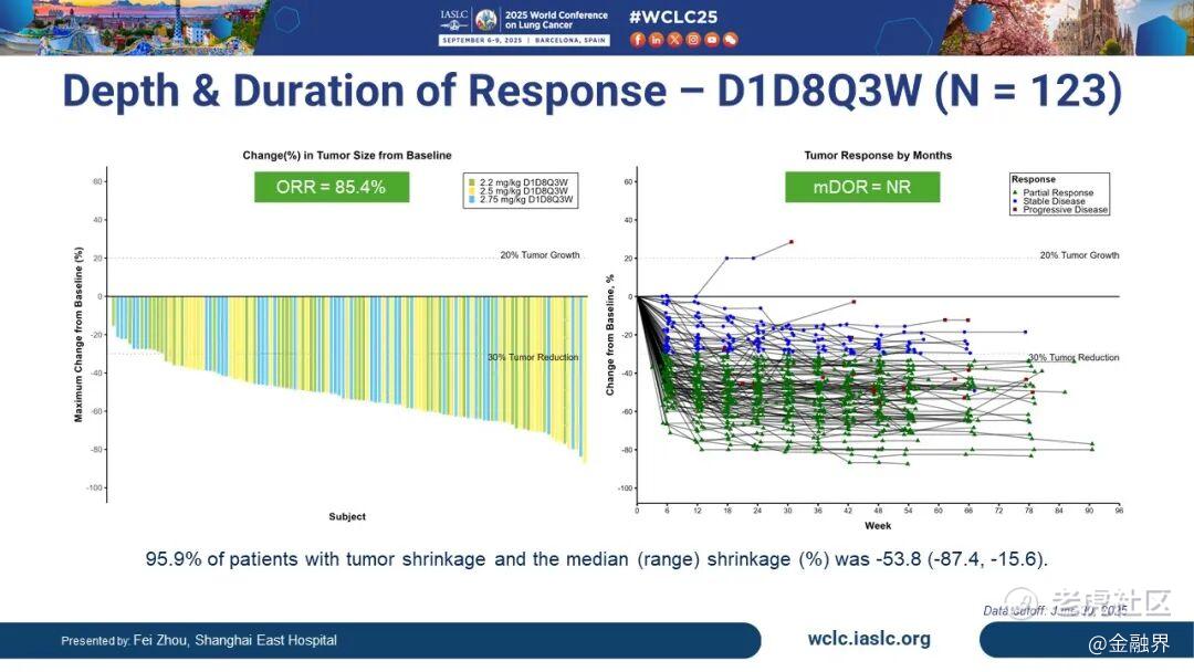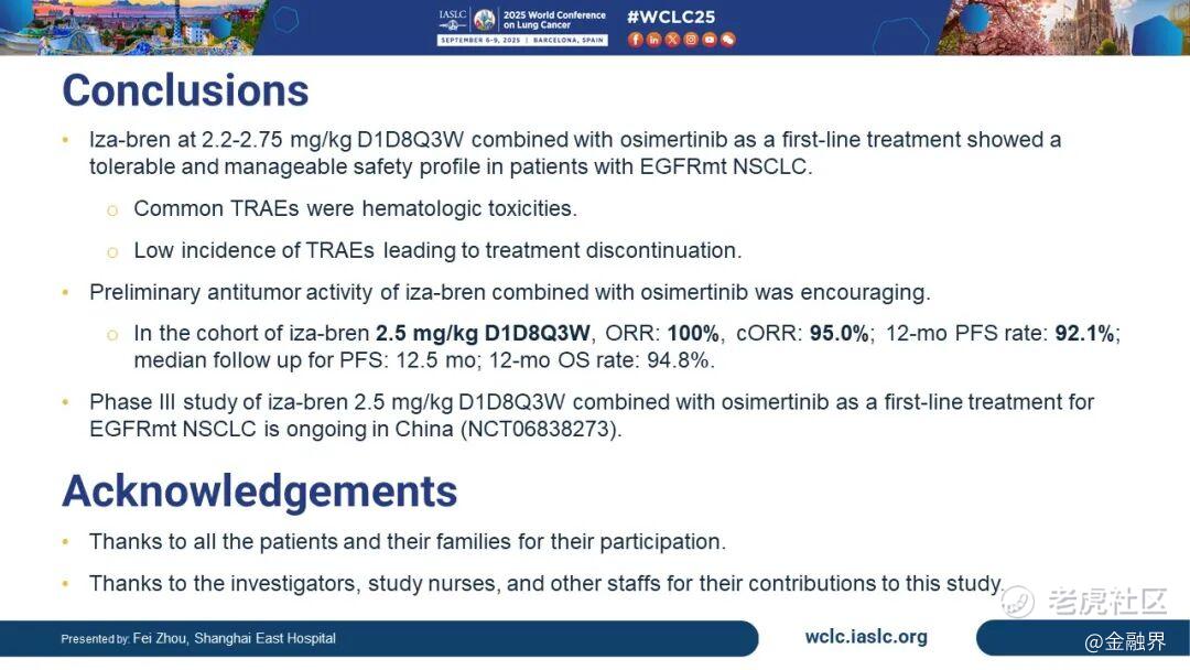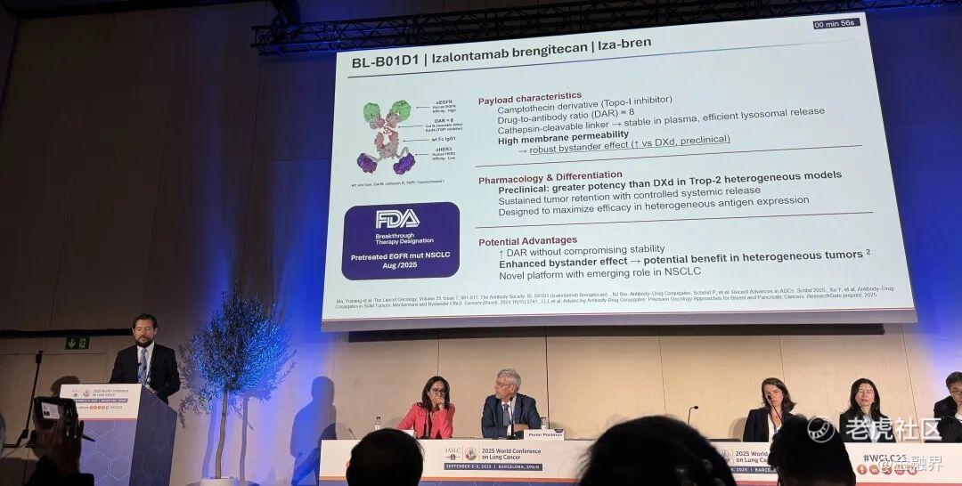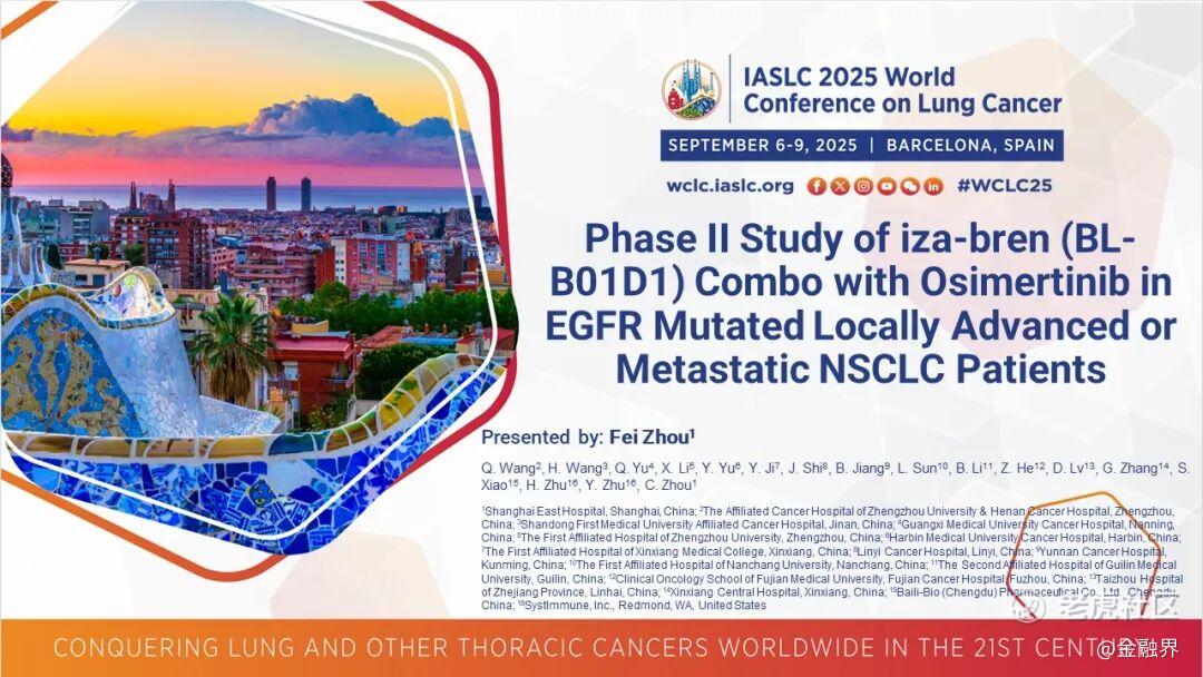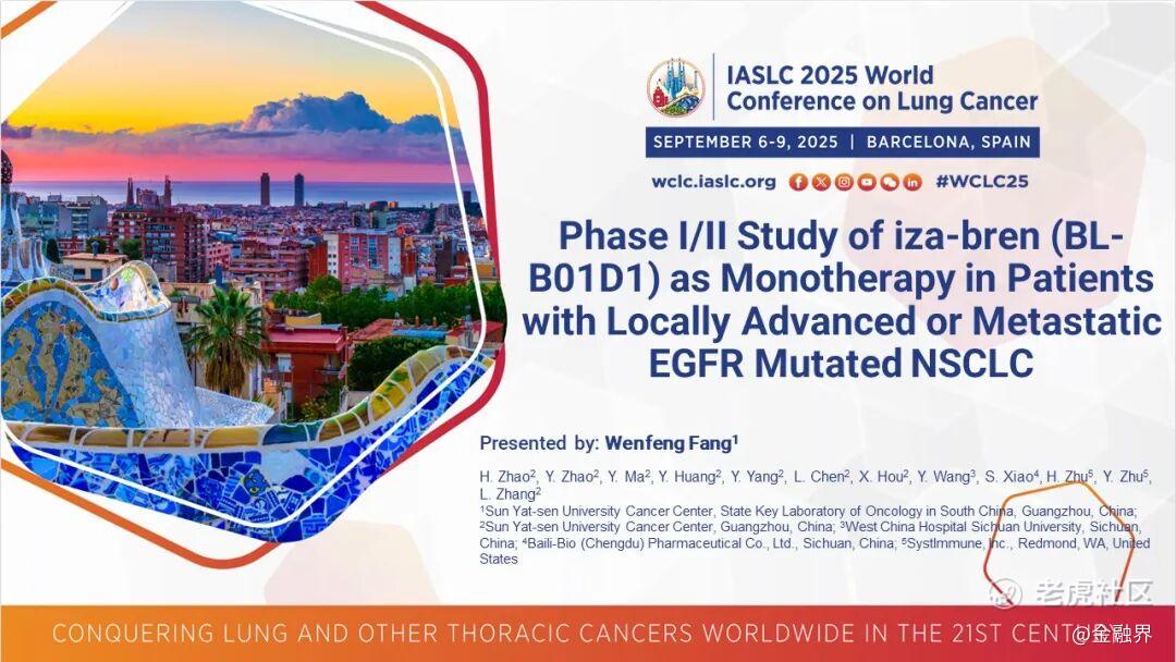 据百利天恒官方账号9月9日发布的信息显示:2025年世界肺癌大会(WCLC)上,百利天恒自主研发的iza-bren (EGFR×HER3双抗ADC) 治疗EGFR突变肺癌的两项研究结果获选WCLC官方新闻发布计划(Press Program)并进行了口头报告,这一双重认可充分显示了iza-bren治疗EGFR突变肺癌的重大临床价值和科学突破,具备改变临床实践的真正潜力!来自同济大学附属东方医院周斐教授和中山大学肿瘤防治中心方文峰教授分别口头汇报了两项研究成果,会场内座无虚席,掌声雷动。