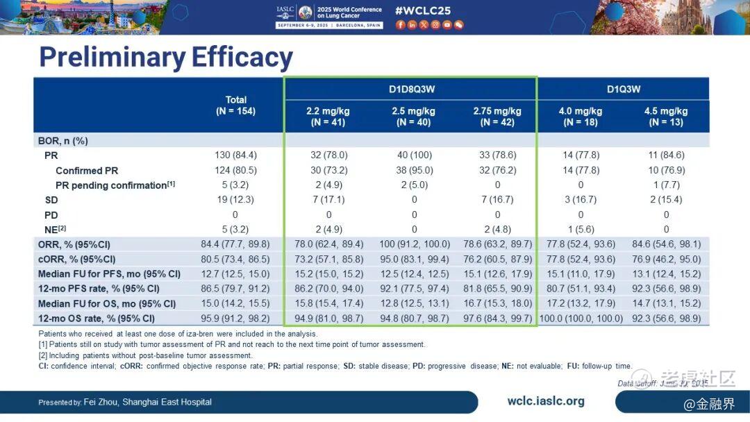 截至 2025 年 3 月 10 日,该研究共纳入 154 例患者接受不同剂量iza-bren (EGFR×HER3双抗ADC) 联合奥希替尼治疗,其中 40 例患者接受iza-bren 2.5mg/kg D1D8 Q3W联合奥希替尼一线治疗,研究结果如下:
