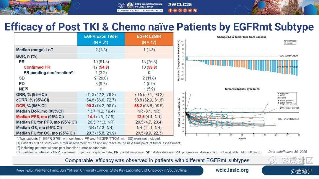mPFS取得历史突破,疗效优势覆盖所有EGFR突变亚组:总人群mPFS 12.5个月,19号外显子缺失突变组为 14.1 个月,21号外显子L858R突变组为 12.5 个月。