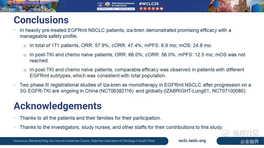 注册III期研究正在全球和中国开展:iza-bren 对比含铂双药治疗第三代EGFR-TKI 进展后EGFR突变 NSCLC 的全球 II/III 期多中心临床试验IZABRIGHT-Lung01(NCT07100080)和iza-bren 对比含铂双药治疗第三代EGFR-TKI进展后的EGFR 突变NSCLC的中国 III 期多中心临床试验(NCT06382116)。