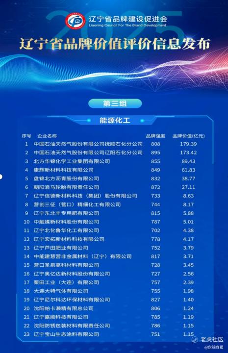 此外,在发布的企业品牌价值评价结果榜单中,我市11个企业品牌入围,其中北方华锦化学工业集团有限公司品牌价值最高,达到89.43亿元,品牌强度为855分,位列能源化工行业第三名。
