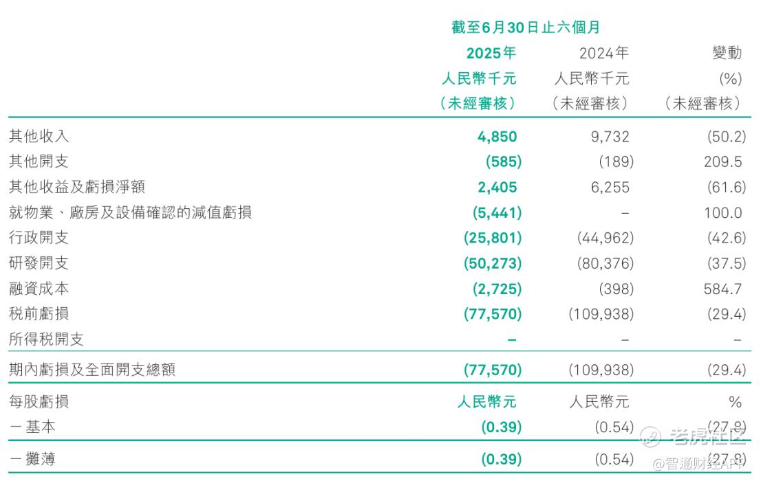 根据绿竹生物最新披露的2025年半年报,公司目前仍未有产品商业化,当期主营业务收入依然为0;其他收入为485万元,较2024年同期的973万元下降50.2%,主要原因是政府补助减少;与此同时,当期其他开支由19万元增加至59万元,增幅达到209.5%。但公司当期净亏损持续收窄至7757万元,同比减少29.4%,研发投入同比下降37.5%至5027.3万元。