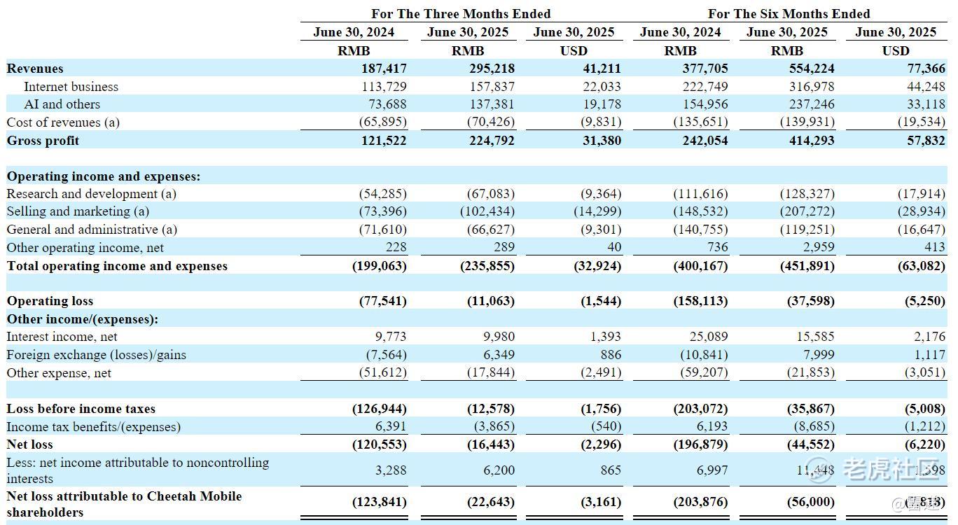 猎豹移动2025年上半年来自互联网收入为3.17亿元(约4425万美元),较上年同期的2.23亿元增长42.2%;来自AI的收入为2.37亿元(约3312万美元),较上年同期的1.55亿元增长52.9%。