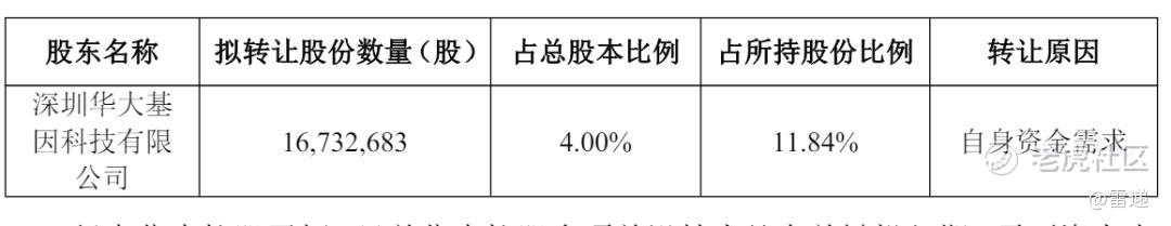 深圳华大基因股份有限公司(证券代码:300676 证券简称:华大基因)日前发布公告,称深圳华大基因科技有限公司(简称华大控股)拟转让股份总数为 16,732,683 股,占深圳华大基因股份有限公司(简称华大基因)总股本的比例为4%。