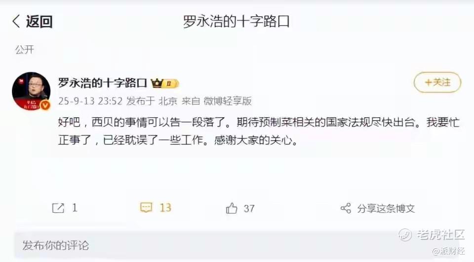 9月13日晚,罗永浩微博最新发文称西贝的事情可以告一段落了,全文如下: