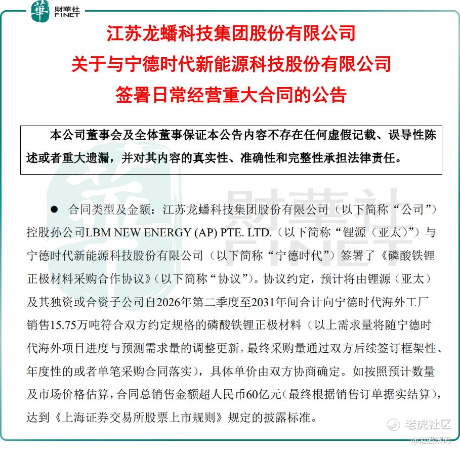 协议约定,预计将由锂源(亚太)及其独资或合资子公司自2026年第二季度至2031年间合计向宁德时代海外工厂销售15.75万吨符合双方约定规格的磷酸铁锂正极材料。如按照预计数量及市场价格估算,合同总销售金额超人民币60亿元。
