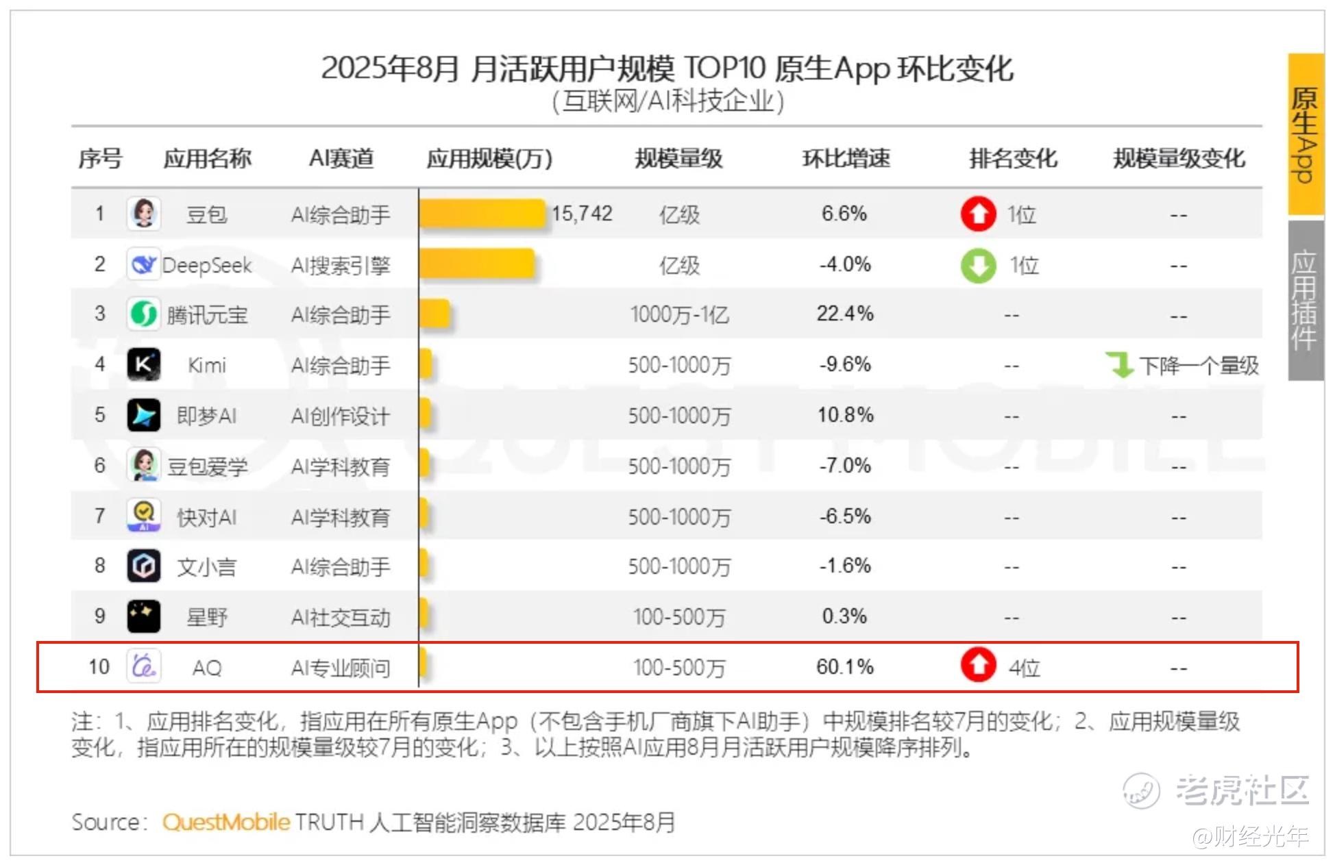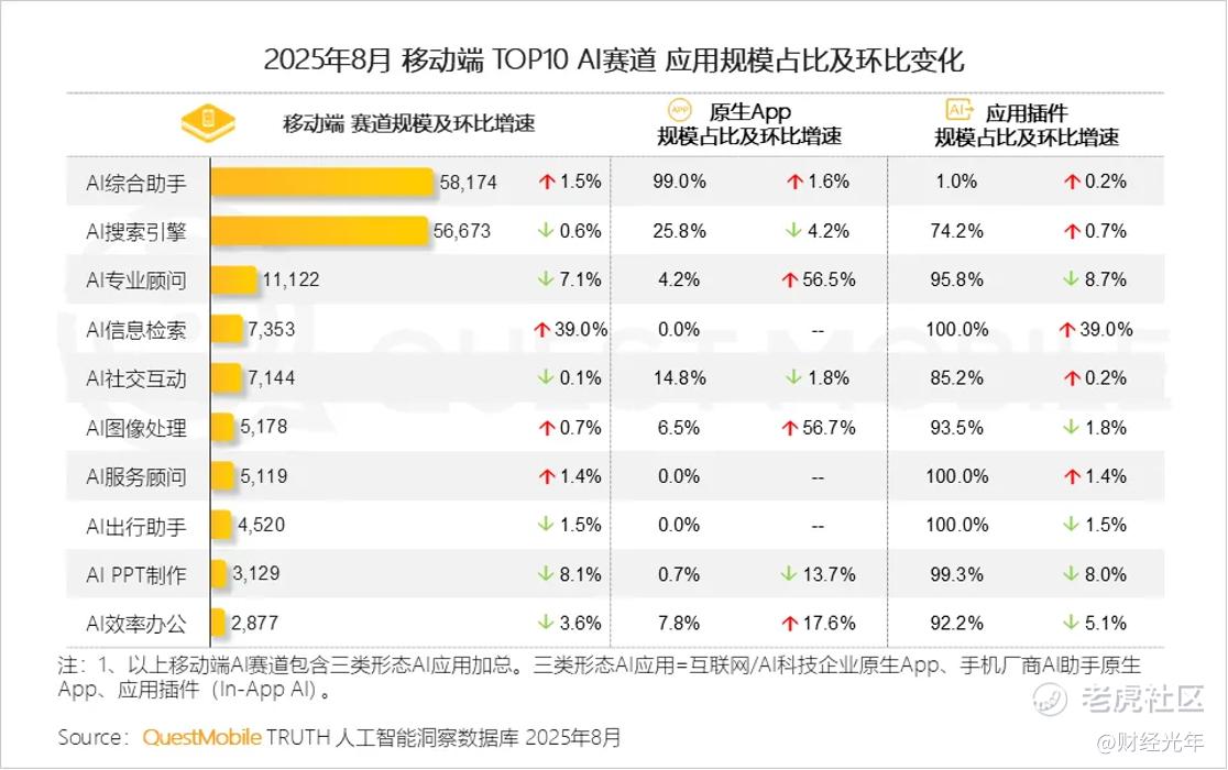 据QuestMobile报告显示,AI原生应用赛道前三分别为综合助手、搜索引擎和专业顾问。不难看出,前两大赛道规模仍遥遥领先,但AI专业顾问这一赛道正表现出巨大发展潜力:原生App环比增速达56.5%,远超第一、二大领域,AQ也闪电入围了全行业榜单的前10。