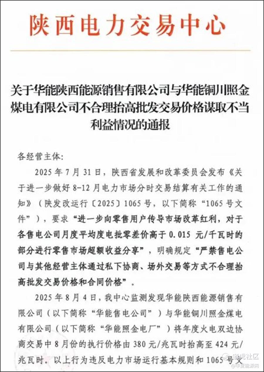 8月7日,陕西电力交易中心突然发布通报称,华能陕西能源销售有限公司与华能铜川照金煤电有限公司“串谋”,“不合理抬高批发交易价格,谋取不当利益”“侵害电力用户合理权益,扰乱电力市场价格秩序”。这是很少见的地方机构公开批评央企公司,一时之间舆论哗然。