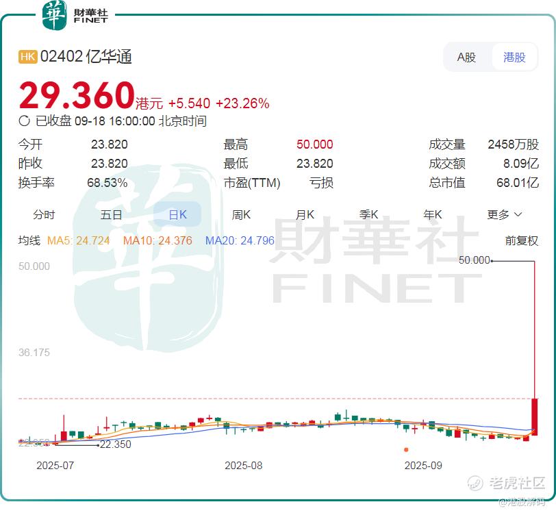 随后亿华通股价持续回落,收盘仍大涨23.26%,与此同时,A股的 $亿华通(688339)$ 一度触及20%涨停板,收盘涨13.38%。