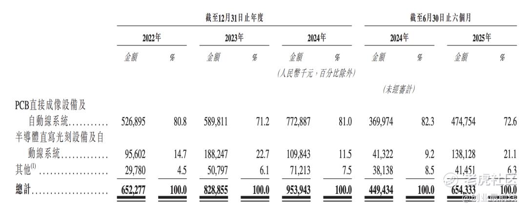 PCB业务是芯碁微装的核心业务,在2022年、2023年、2024年及2025年上半年(以下简称“报告期”),营收占比分别为80.8%、71.2%、81%及72.6%。