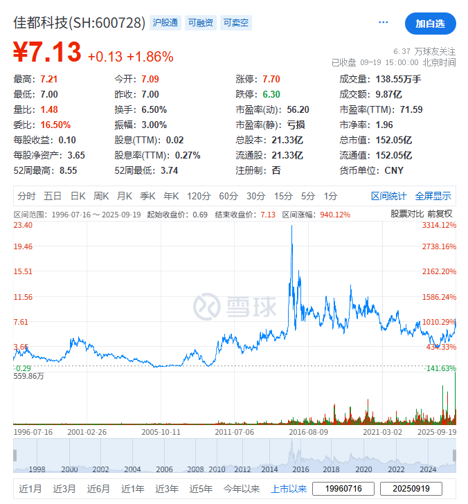 佳都科技(600728.SH),于1996年在A股上市,截至周五(2025年9月19日)其总市值约人民币152亿元。