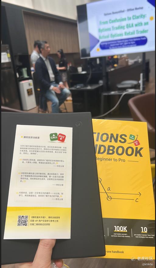 哪怕是新手,没有特别复杂的策略,只要好好学,我们可以通过几种常见的“用期权降低风险”的策略,轻松实现这个目标。这个周末去老虎证券的新加坡总部,参加他们的一个免费的期权交流会,进场就收到了一本期权交易指导书,还有一本笔记本,真的是打瞌睡就来了好枕头,[666] 谢谢老虎社区举办的好活动![比心]