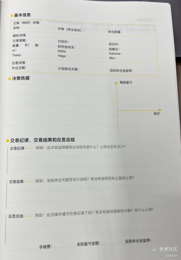 话说我特别喜欢这本黑色的笔记本,这个交易记录栏目,是我的最爱,平时我买卖期权,都是随心而动,没有特意去想,更加没有去记录下来,这个交易小结,给我们普通玩家一个归纳打法,记录我们胜率的进步。我认同这句话 - 不复盘的交易,是经验的浪费。