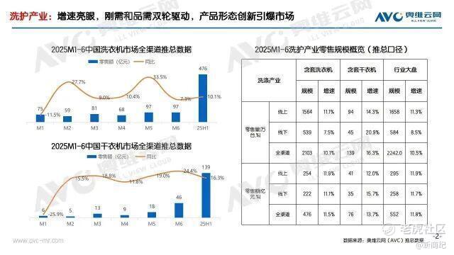 从奥维云网统计的2025H1洗护零售市场分析报告中可以看到:洗衣机实现销售额476亿元,同比增长11.5%,销量2103万台,同比增长16.3%,而多筒洗衣机产品线上渗透率也非常猛,从3月的3.2%冲到5月的9.5%,成了增长最快的细分品类。