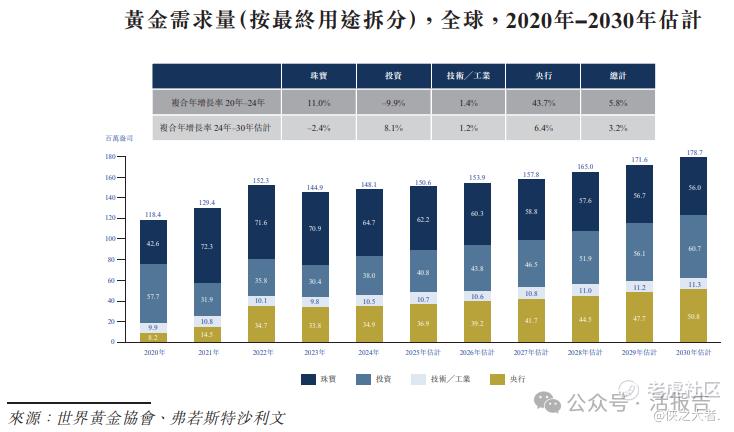 根据弗若斯特沙利文(Frost & Sullivan)的报告,全球黄金需求从2020年到2024年经历了波动,2022年后小幅下降,整体以5.8%的复合年增长率增长,而2024年以来需求呈现加速增长态势,预计到2030年将达到178.7百万盎司。